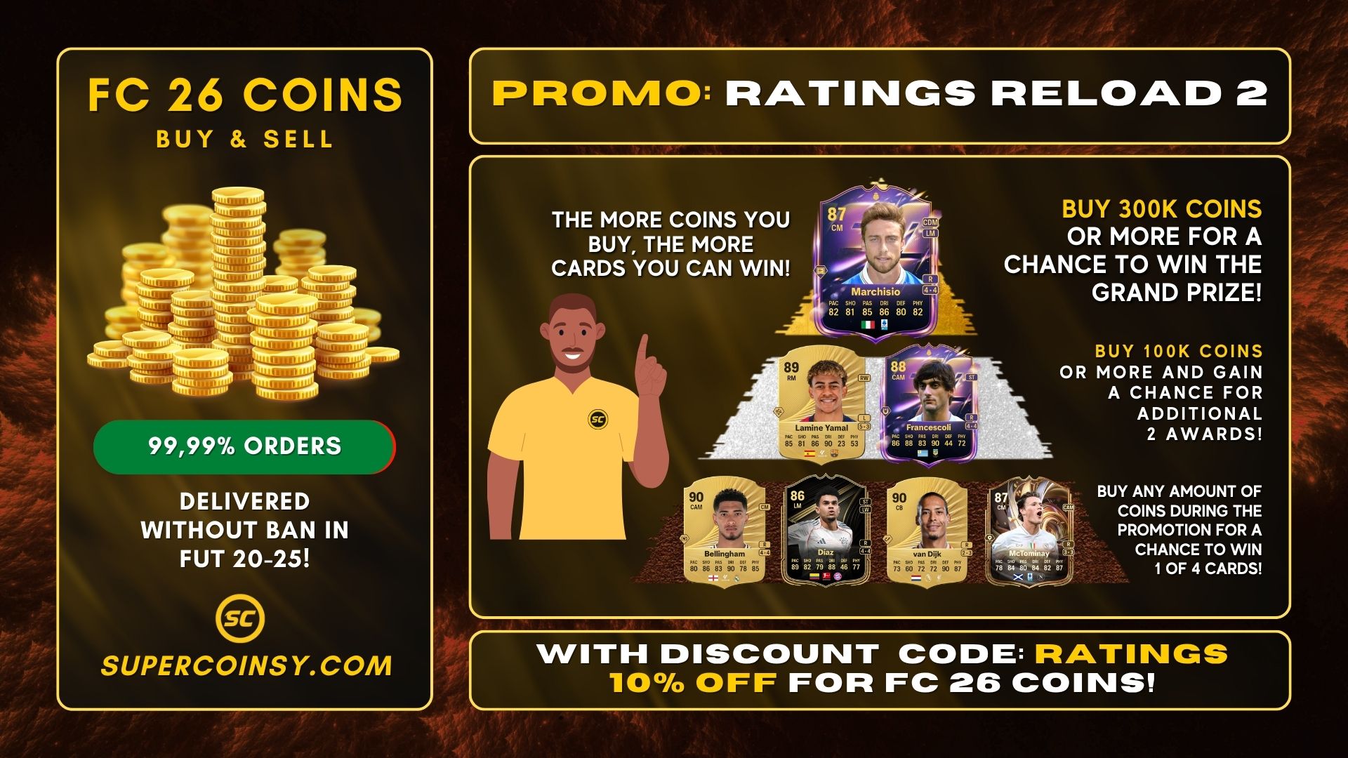 1. Discount code: RATINGS guarantees a 10% discount on the FC 26 Coins product and products from BUY SBC category. The code can be used multiple times and is available to every customer.