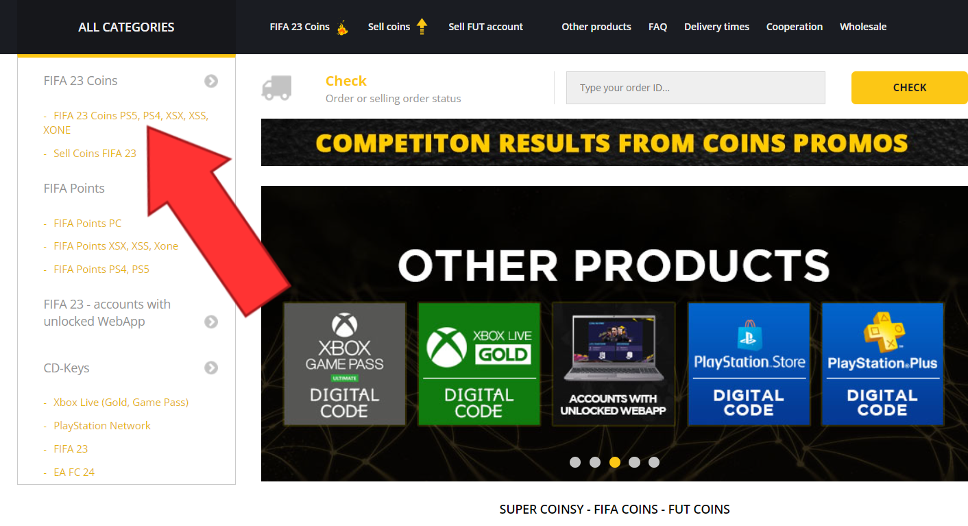 Vælg et produkt fra vores tilbud på hjemmesiden, såsom Ultimate Mønter, en konto med et ulåst overførselsmarked i WebApp, en PSN-top-up eller noget andet.