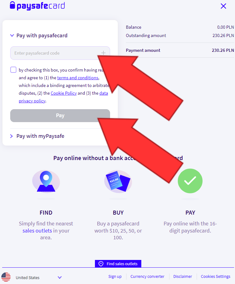 Du vil derefter blive omdirigeret til betalingsudbyderen Cashbill (denne side er muligvis tilgængelig på polsk, men følg venligst vores instruktion). På deres side skal du vælge PaySafeCard-muligheden, udfylde dine oplysninger, dvs. e-mail og for- og efternavn, og klikke på knappen "Betal", som vist på billedet nedenfor: